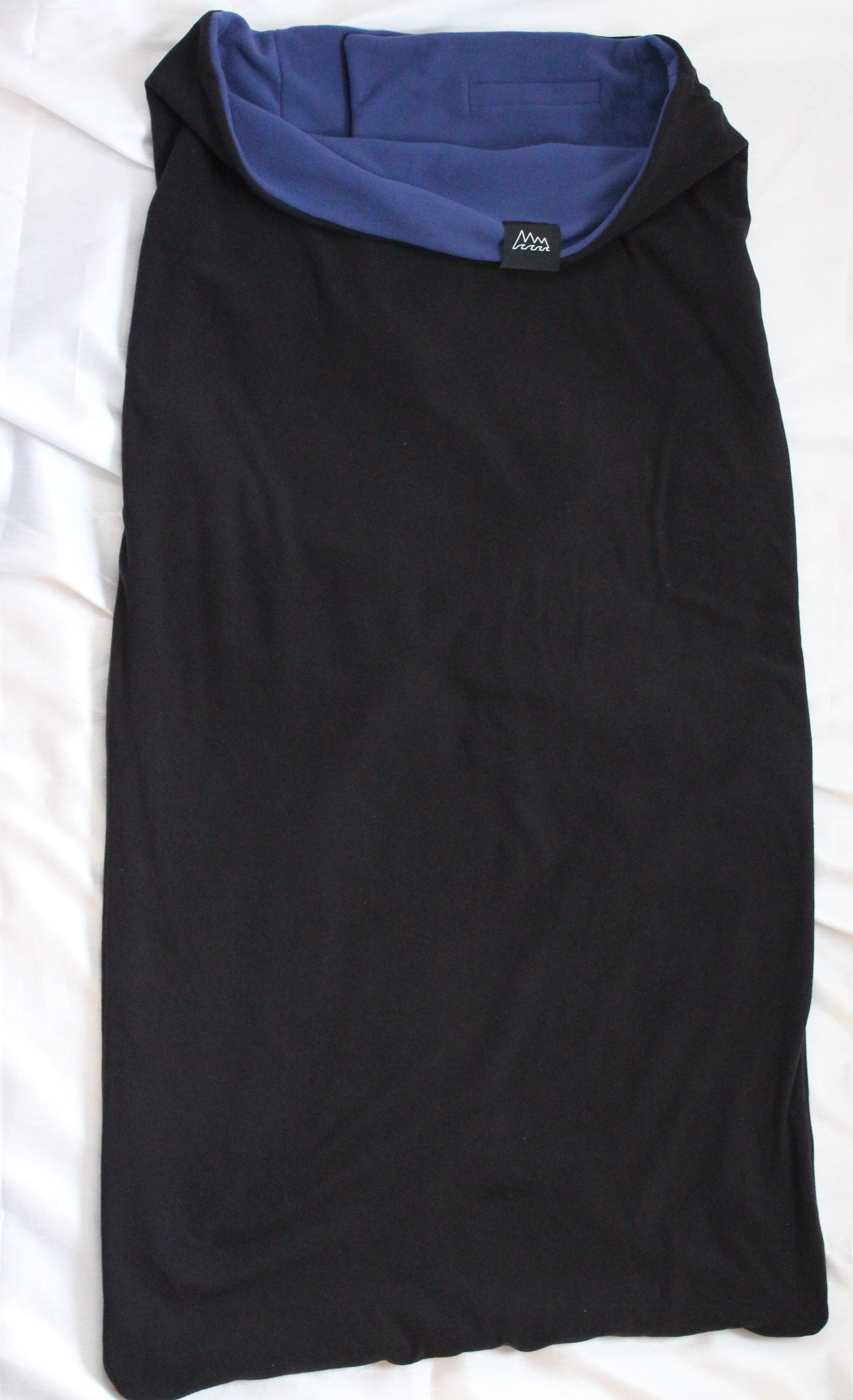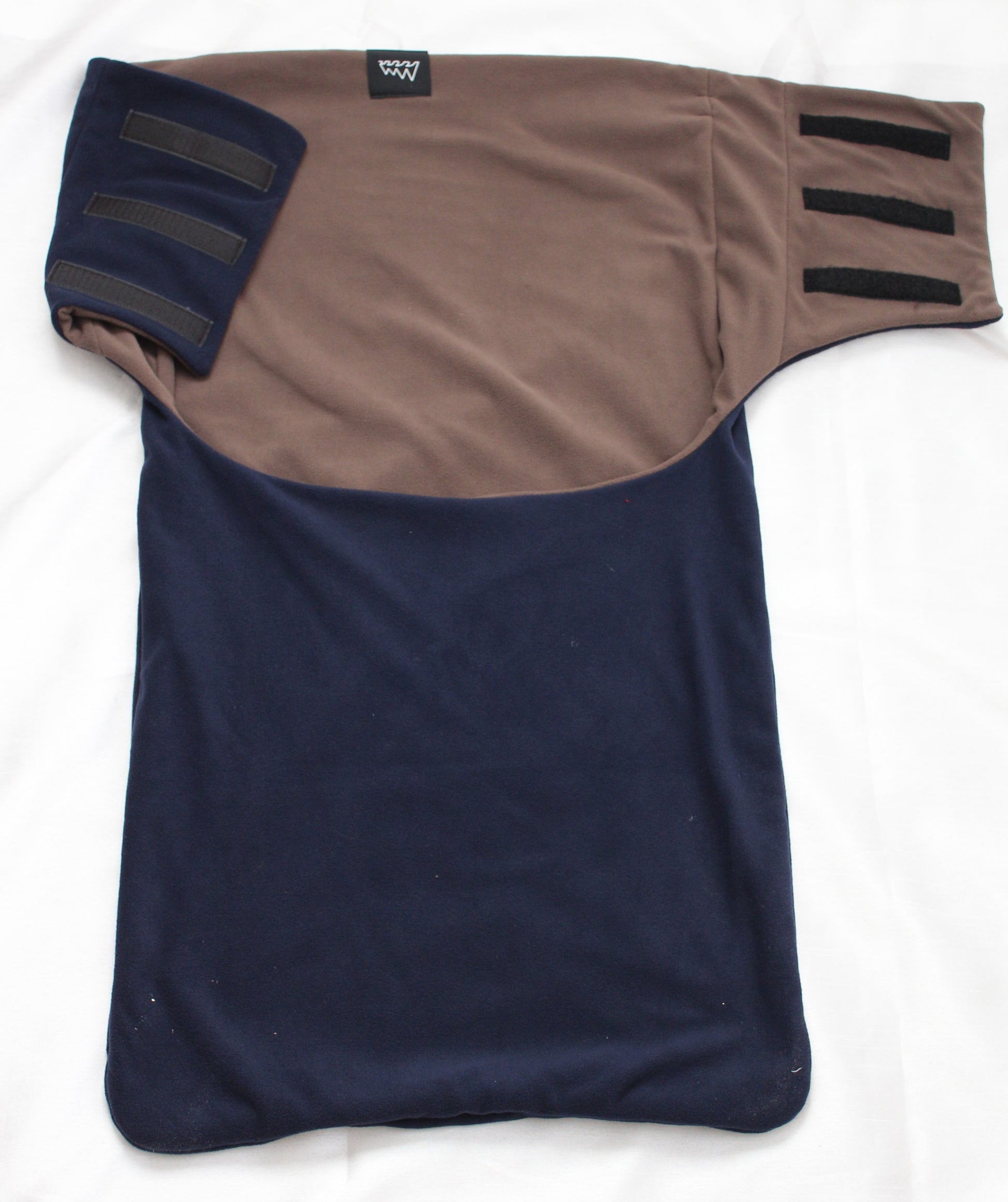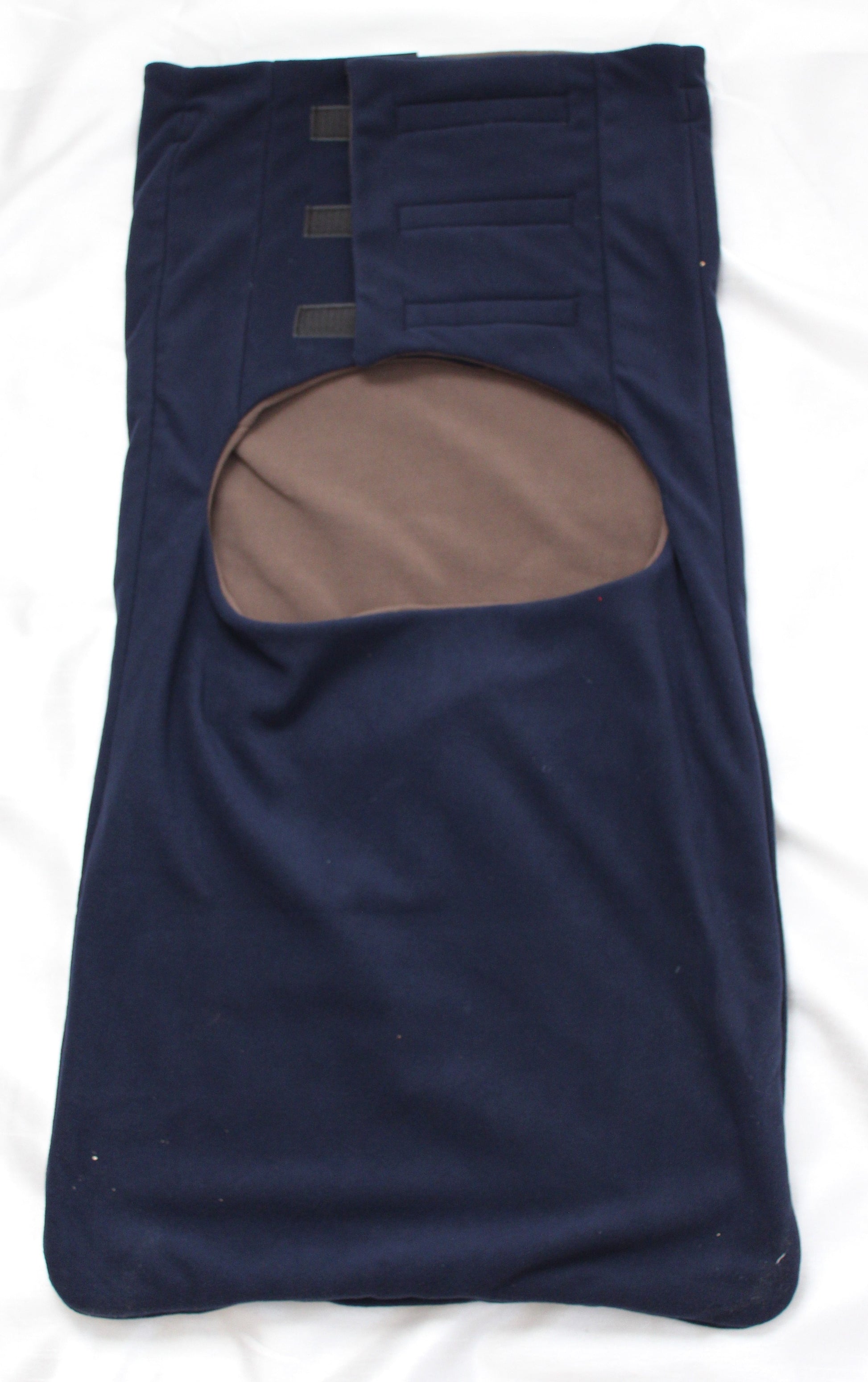 Reversible Double-lined fleece leg sack that attaches with Velcro behind the wearers back securing it in place while also protecting the lower back area against the cold. In many cases, it can also be stretched around the back of a custom molded seat to fasten behind the back rest (of some wheelchairs). The sack is tucked around the thighs and pulled up the back of the legs to ensure the best coverage.