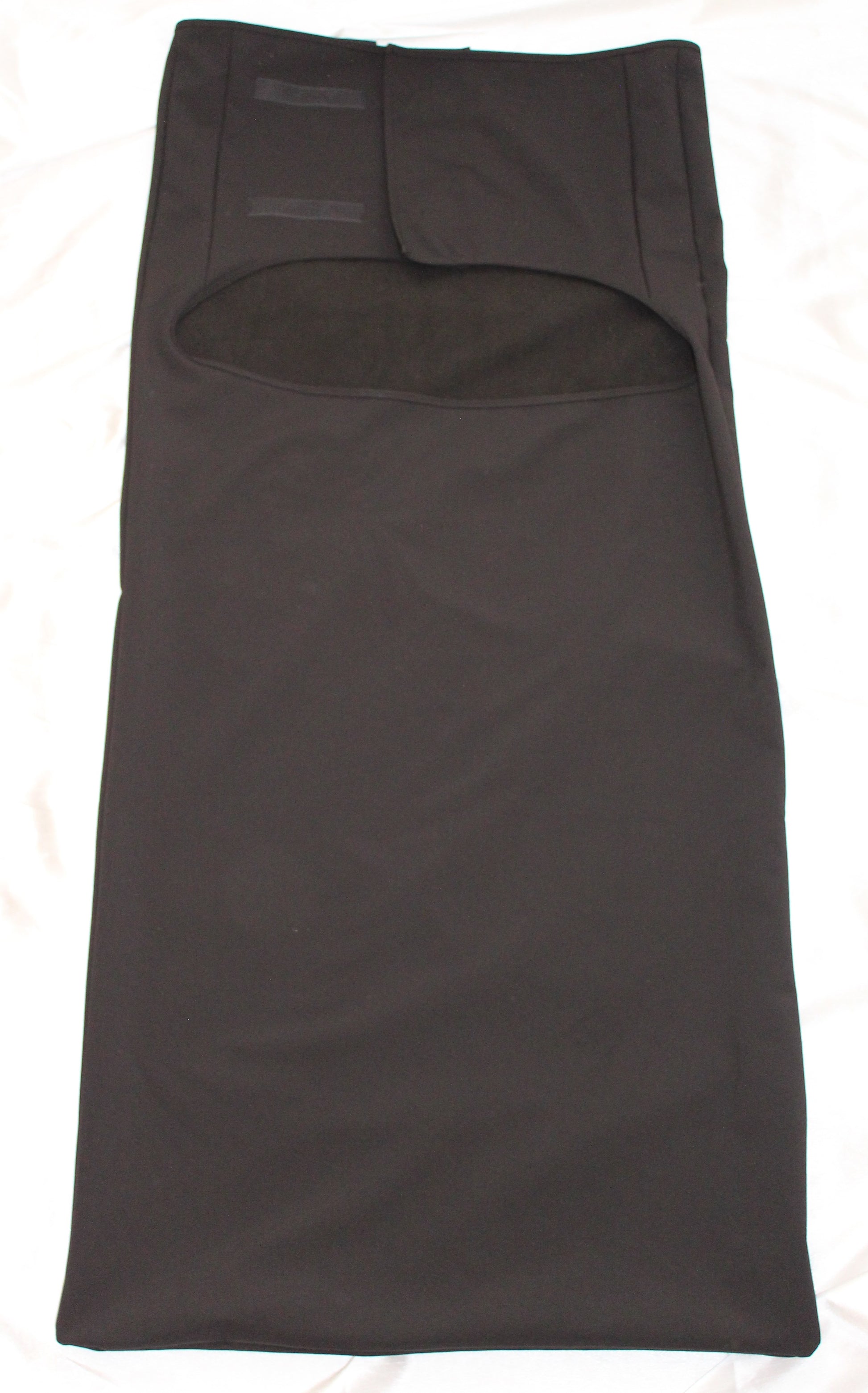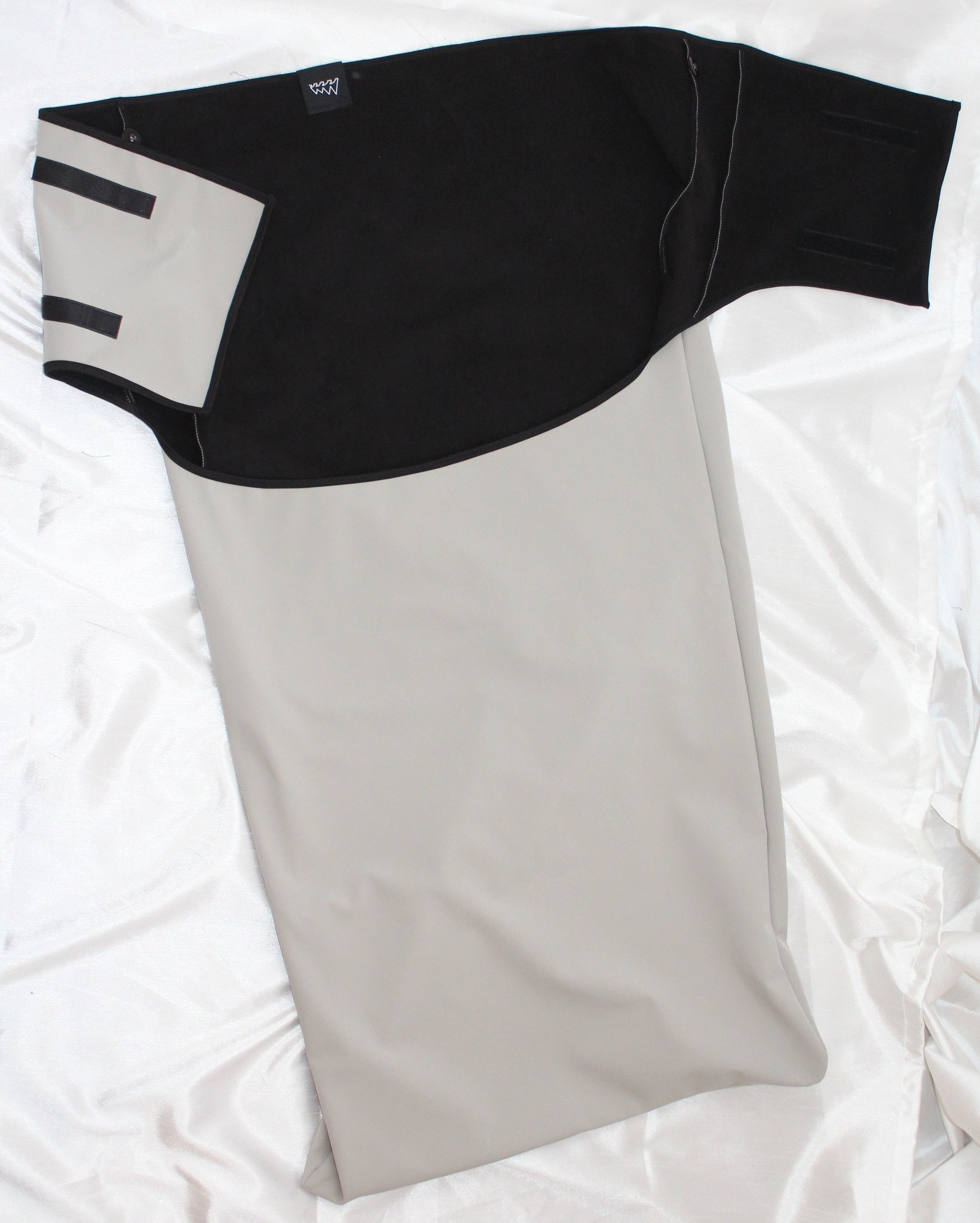 The All Weather Leggy is made with a thin fleece-lined all-weather fabric making it resistant to wind and water. The weight of this fabric is similar to a raincoat fabric. This leg sack surrounds the legs and attaches with Velcro behind the wearers back securing it in place while also protecting the low back area against the elements. In many cases, it can also be stretched around the back of a custom molded seat to fasten behind the back rest (of some wheelchairs). The sack is tucked around the thighs and pulled up the back of the legs to ensure the best coverage. This piece, paired with the double lined fleece sack gives you the ultimate warmth and weather protection for days spent outdoors or in cold environments.